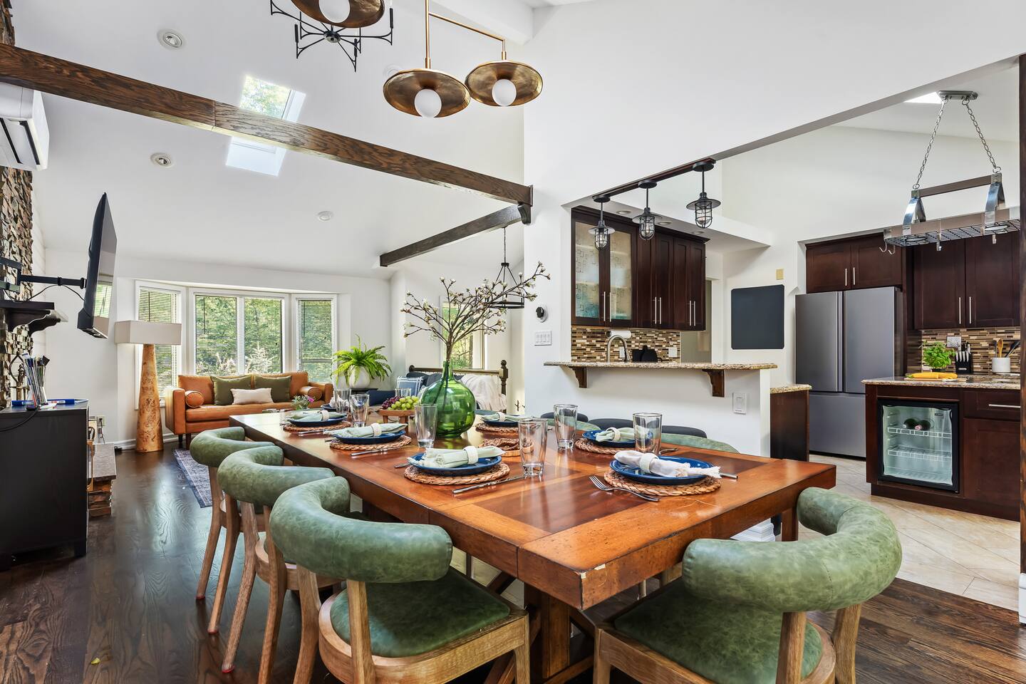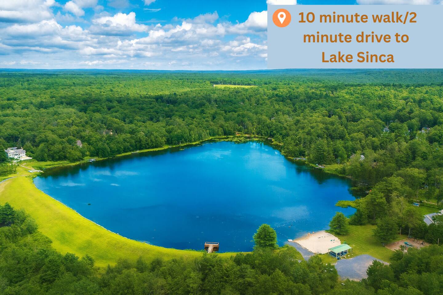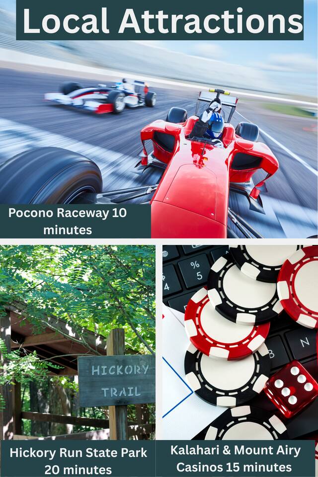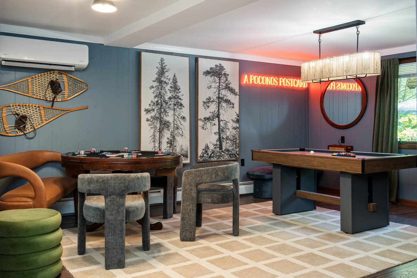 Stylish, home-like décor makes it feel like a family’s weekend ski or lake home, not a sterile rental. This isn’t just a vacation house—it’s an entertainment headquarters for your whole crew. 🎉 Discover our Pocono cabin: Indigo Pines Lodge is stylish, family-friendly, and surrounded by the natural beauty of the Poconos. Perfect for a family reunion or a fun-filled friends trip. Rustic cabin interior design with modern amenities, indoor games and outdoor adventure. With five bathrooms—more than most rentals in the area—everyone can get ready without waiting in line. 🏡 House Highlights ✅ Sleeps 16 Comfortably – Perfect for multigenerational families & groups ✅ Lake Access-10 minute walk to Lake Sinca, 15 minute drive to Lake Harmony ✅ Private Hot Tub and Indoor Sauna – Relax under the stars after a day of adventure ✅ Movie Room & Popcorn Bar – Large room with comfy couch plus lounging chairs. Theater style popcorn bar with 8 different popcorn seasonings. ✅ Fire pit ✅ Game Room Fun – Poker table, pool table and over a dozen board and card games. ✅ Indoor bar – Extra kitchenette bar with fridge and extra kitchenwares. ✅ Arcade room--basketball, 3 arcade games and bean bags to relax and play video games. ✅ Fully Equipped Kitchen – Everything you need to cook delicious meals. Includes a gas range, premium appliances, coffee bar (complimentary coffee and tea). ✅ Cozy Living Room – Fireplace, plush seating & 72" Smart TV for movie nights ✅ Fast WiFi + Smart TVs – Stay connected & entertained ✅ Outdoor Space-private yard, fireplace, sauna, hot tub and yard games ✅Large deck with seating for 18, 2 lounge seating areas. ✅Under deck HOT TUB. Perfect all year all weather!! with outdoor bar and hanging chairs. ✅Parking for 8+cars in circular driveway 🛏 Sleeping Arrangements *Huge bedrooms, multiple living areas, and 2 floors so kids and adults can spread out. *The main floor has four bedrooms including both master suites and two additional secondary bedrooms. The lower level has three more rooms including two secondary bedrooms and a kid's room/playroom with bunks. 💤 Master Bedroom #1 (Upper Level) – Queen bed on suite , premium luxury linens, 43” Smart TV, en-suite private ensuite bathroom with large soak tub, and walk-in shower 💤 Master Bedroom #2 (Upper Level) --Extra large room with King bed, & seating area and 43” Smart TV. 💤 Bedroom 3 (Upper Level) – Queen bed, premium luxury linens. 💤 Bedroom 4 (upper Level) – Queen bed, premium luxury linens. 💤 Bedroom 5 (Lower Level) – ,King bed, premium luxury linens. 💤 Bedroom 6 (Upper Level) – King bed, premium luxury linens. 💤 Bedroom 7 (Lower Level) – 4 Bunk beds (Full over Full), premium luxury linens, toys, books and games. 🎯 Ultimate Kids Arcade Room Challenge your friends and family in the fully loaded game room, featuring: 🎮 3 Arcade Machines – Classic & modern games Karaoke Machine Bean bag seating 65" TV for video game fun Ultimate Game room for older kids and Adults 🎱 Pool Table – Fun for all skill levels Poker Table-- 2 dozen board and card games Jukebox- greatest hits Karaoke Machine Large seating area with 75" TV for Movie Night 🍳 Kitchen & Living Space The open-plan kitchen and living area is the heart of the home, featuring: Gourmet Kitchen: Gas range, Instant Pot, blender, griddle and spices. Coffee Bar: Complimentary coffee and tea, and supplies included. Dining Space: Seating for 11 for casual meals. Living Area: 55” Smart TV, gas fireplace and cozy seating area. From sauna heat to hot tub bubbles to a luxurious master suite, every corner of this home is designed for pure relaxation. 🌲Large Private Yard 🛁 Private Hot Tub – The perfect way to unwind after a day out 🔥Indoor Sauna -- Detox and destress in your private sauna with a view 🔥 Grill & Outdoor Seating – Enjoy BBQs with breathtaking views 🚗 Perfect Location – Minutes from Top Attractions! Sleeps 16+ comfortably 🔑 Guest Access Guests have full access to the community lake, picnic gazebo, and playground. The longer you stay, the bigger the discounts.” Inquire now for seasonal discounts. Guests have full access to: entire house, hot tub, sauna & private yard. Private driveway parking (comfortably fits 5-6 cars). High-speed internet, keyless entry, and smart home features. 📋 Things to Note Pool, Sauna and Hot Tub Usage: Follow provided guidelines for safe use. Lake may also be used for catch and release fishing, with proper fishing license. Bear Safety. Rural area where wild animals (including bears) can be spotted, especially at night. Kid-Friendly Features: Pack N Play, high chair, toys and books.